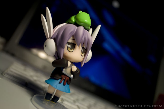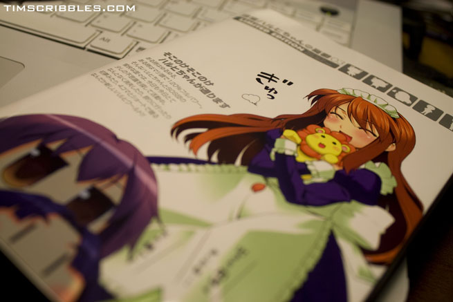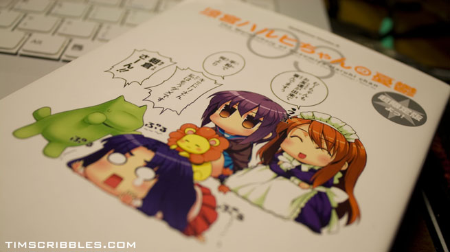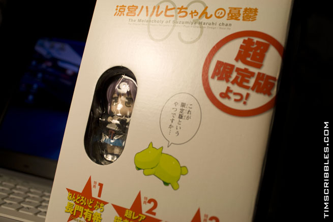 Its a limited edition copy of the Haruhi Chan manga volume 3 that comes with a figure. Retail is $16 or so…I paid maybe…3-4 times that value since we don’t get any cool stuff over here. And its supa rare. XP